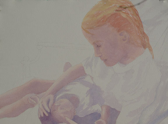 I worked on this during today's Thursday afternoon watercolor painting session. I still have much to go, but due to spot-on critiques during my efforts I see where I still have to soften some edges, soften some darks, and continue to make Aubrey look more like a 5-year-old instead of older than that. Zane's features will suffice when I make the hard lines softer and define his little features better, as well as the shadows, but it will all come in time. I have truly loved working on this one and will continue on....either to the scrap pile or to a framed painting!
